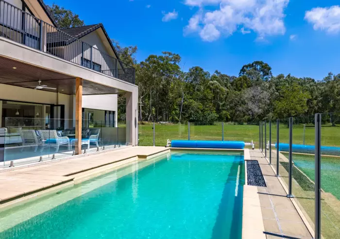 Designed to celebrate natural light and leafy outlooks, every room feels exceptionally spacious, light and airy. The main family living and dining area is open-plan, sleek and modern, with stacker doors offering picture-postcard views of the pool, expansive lawns and forested backdrop.