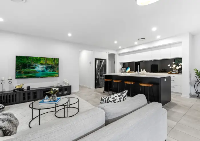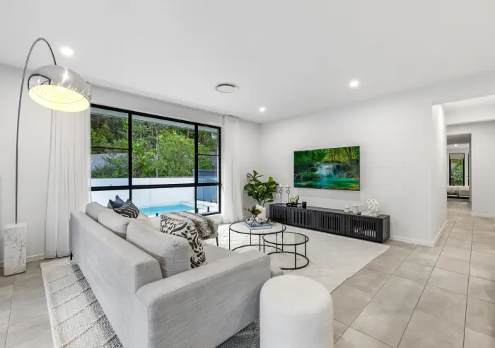 Inside, you will love the quality of finishes and attention-to-detail with crisp white walls, natural tones and open spaces. With 248 square metres of living space, this home is generously proportioned, and feels spacious, light and airy. The open-plan living and dining area is instantly impressive and definitely brings the ‘wow’ factor, with sheer curtains and large black framed windows for plentiful natural light.